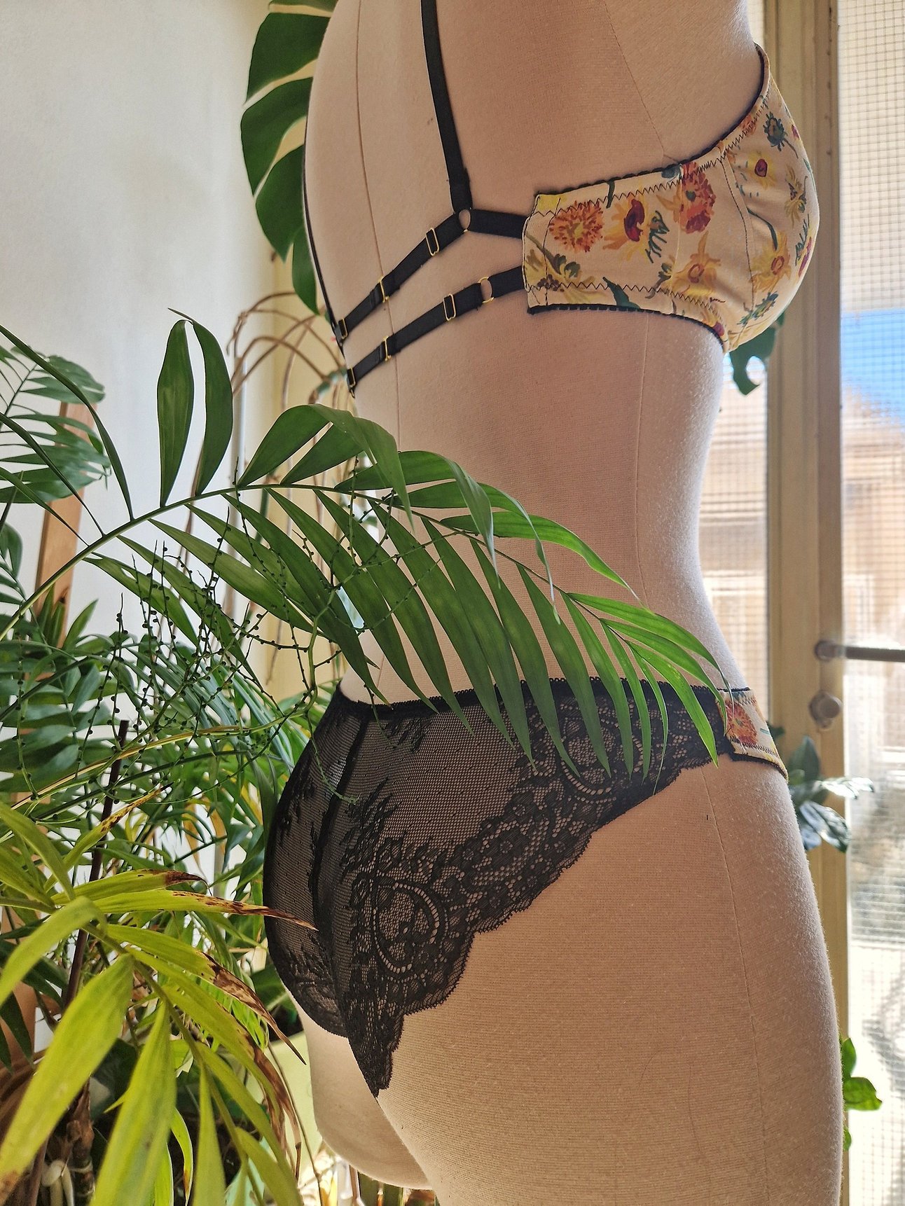 Izrađen od prekrasne Oeko-Tex printane pamučne jersey tkanine, ovaj set savršeno nadopunjuje voljena Ivy Noire čipka koja vas obavija mekom senzualnošću. Grudnjak je u potpunosti podstavljen prozračnom mrežicom za vrhunsku udobnost i ima kopčanje na trakice straga s dvije podesive naramenice za prilagođeno pristajanje.