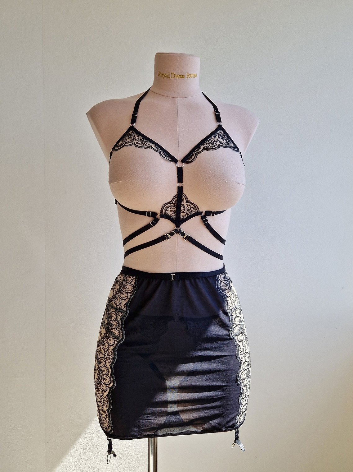The crotchless panty is just as daring, designed to frame your body while offering full access and visual allure. Two adjustable side straps with garter clips wrap around the hips and can either connect to the bra’s central ring for a one-piece playsuit look, or be worn separately as a seductive two-piece set.