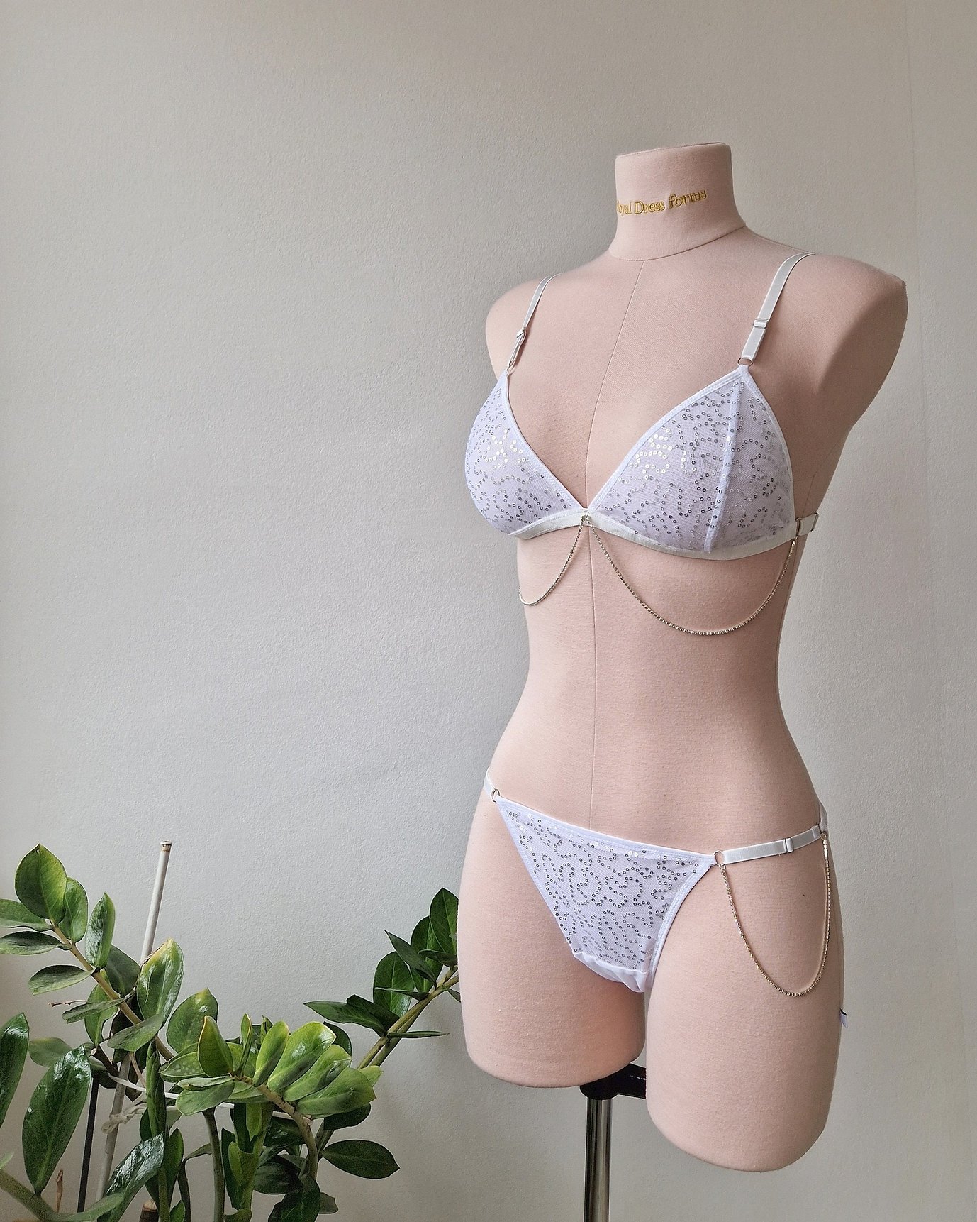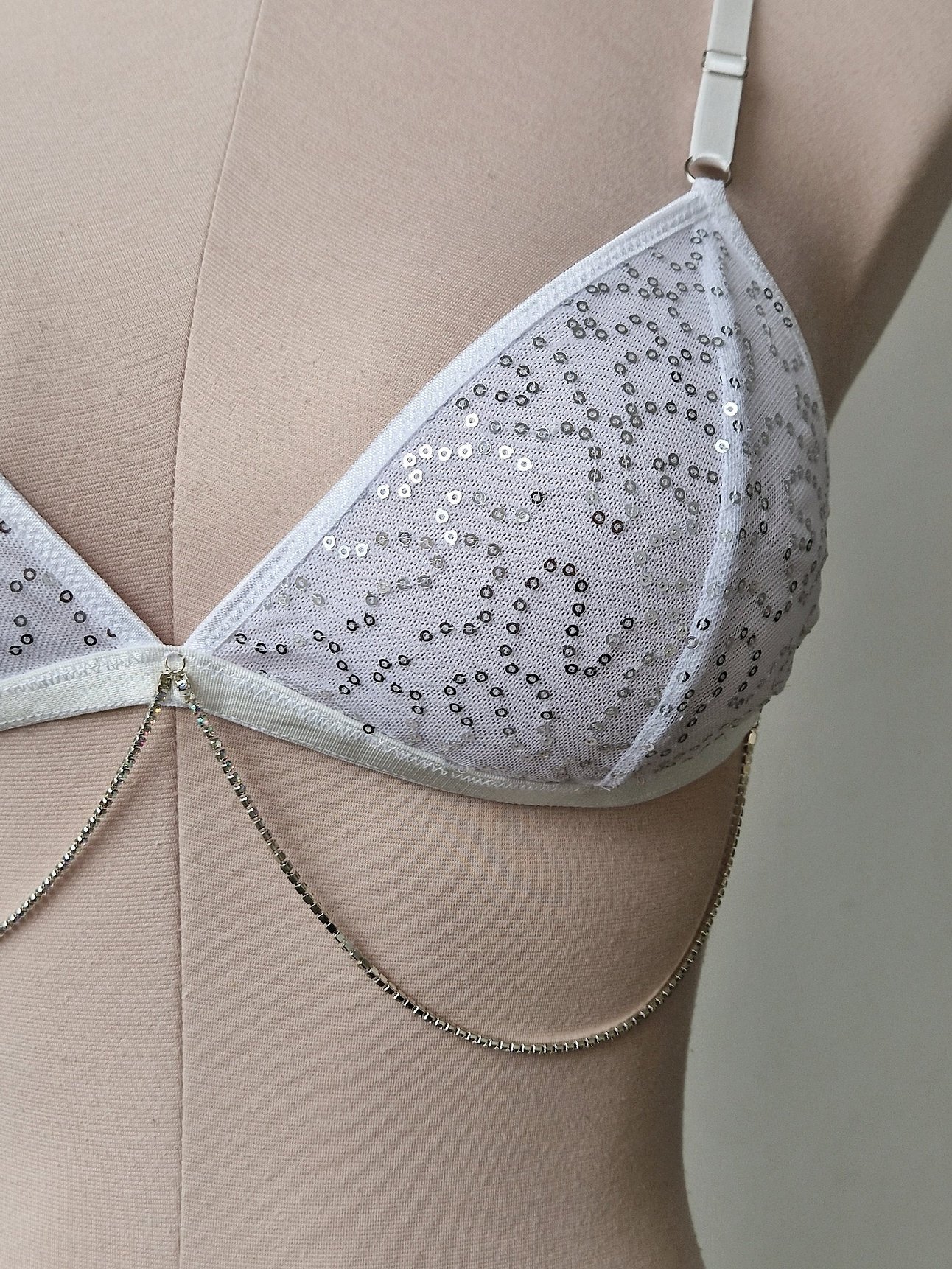 Adorned with shiny silver paillettes that shimmer with every move, this glamorous lingerie set is made for the spotlight. The paillettes are scattered across a soft white mesh in a wavy pattern, evoking the glitter and rhythm of a disco ball. Each piece is fully lined with a second soft mesh for added comfort and a touch of opacity.