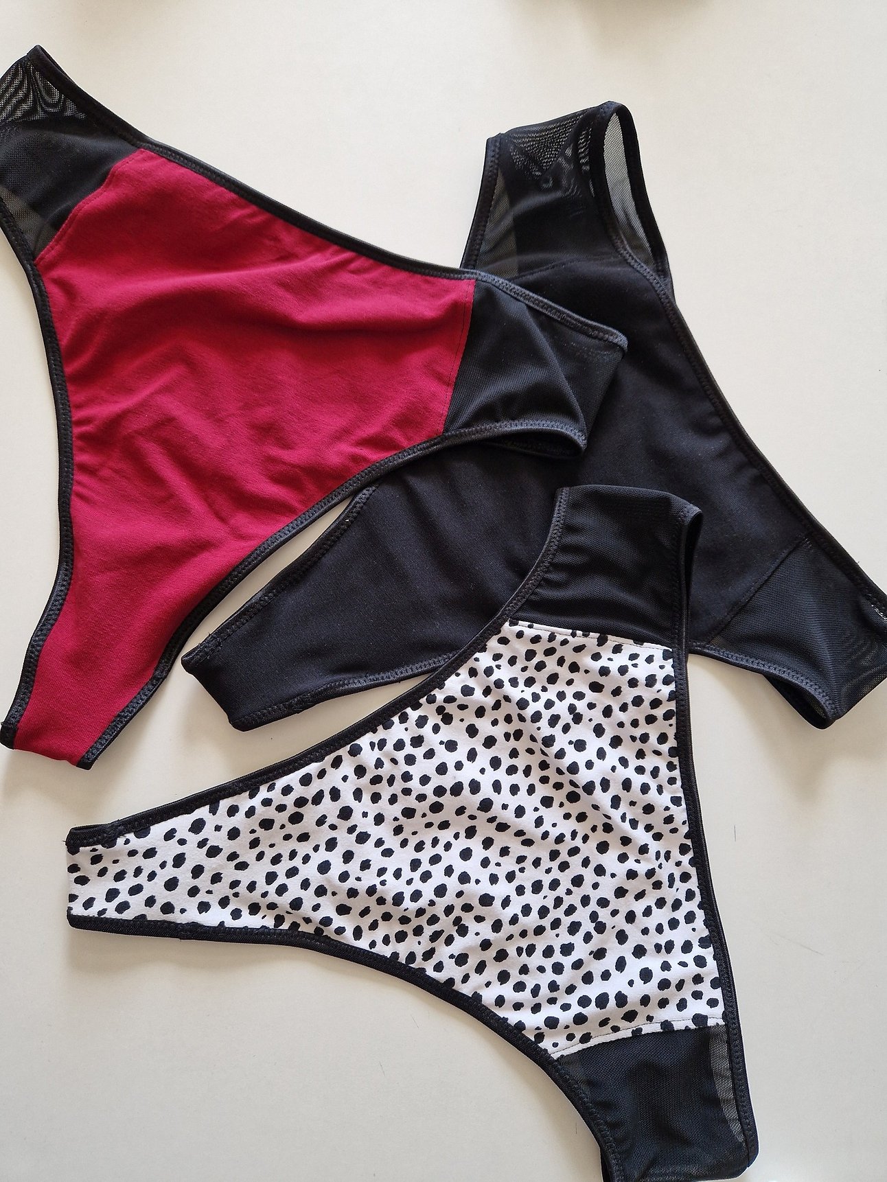 Introducing the Mystery High Waist Thong Packs – a delightful surprise bundle of  high-waist thongs, each uniquely handmade with love and care. Crafted from soft Oeko-Tex certified cotton jerseys and airy mesh panels on the sides, these thongs offer a flattering silhouette, breathable comfort, and a touch of sensual charm.