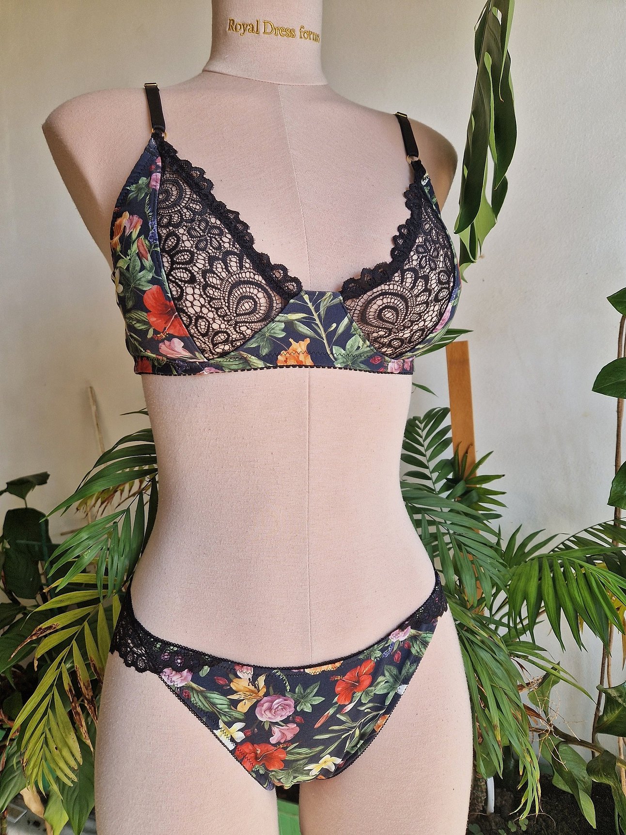 Included are two panties, each designed to pair beautifully with the bra, giving you options to mix and match your look. One panty wraps your hips in the same soft black lace, while the other offers more coverage in the vibrant tropical floral print that makes the Phoebe set so special.