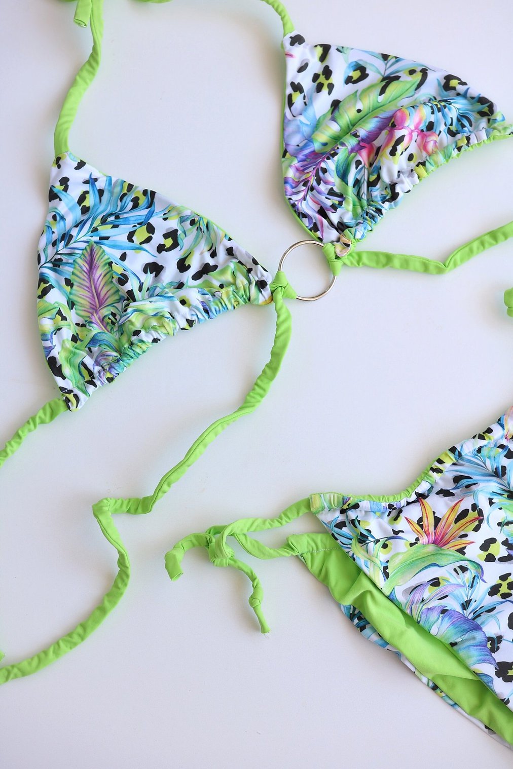 This bikini top is made to your measurements and can be made in a variety of colors. The tropical cheetah print comes with a vibrant green revese side, while the floral print comes with a powder pink on the reverse side. There is a number of solid colors available, and if you would like a combination of two of them on your bikini, please pick your primary color when submitting your order and leave a note of the other color on the revese side that you would like.