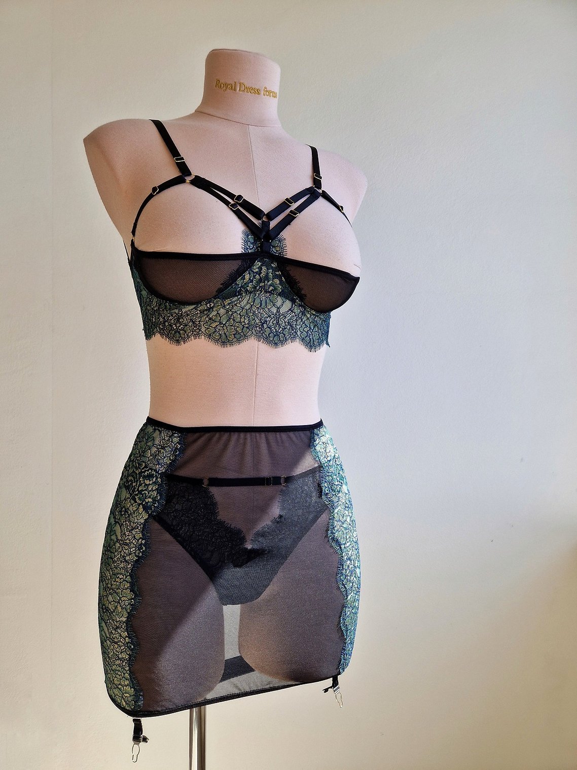 Crafted from soft, slightly sheer black mesh, this girdle wraps your curves with exquisite green eyelash lace threaded with gold for a shimmering, luxurious touch. The lace is appliquéd on both sides for maximum visual impact, while the flattering back cutout spotlights your booty like the star it is.