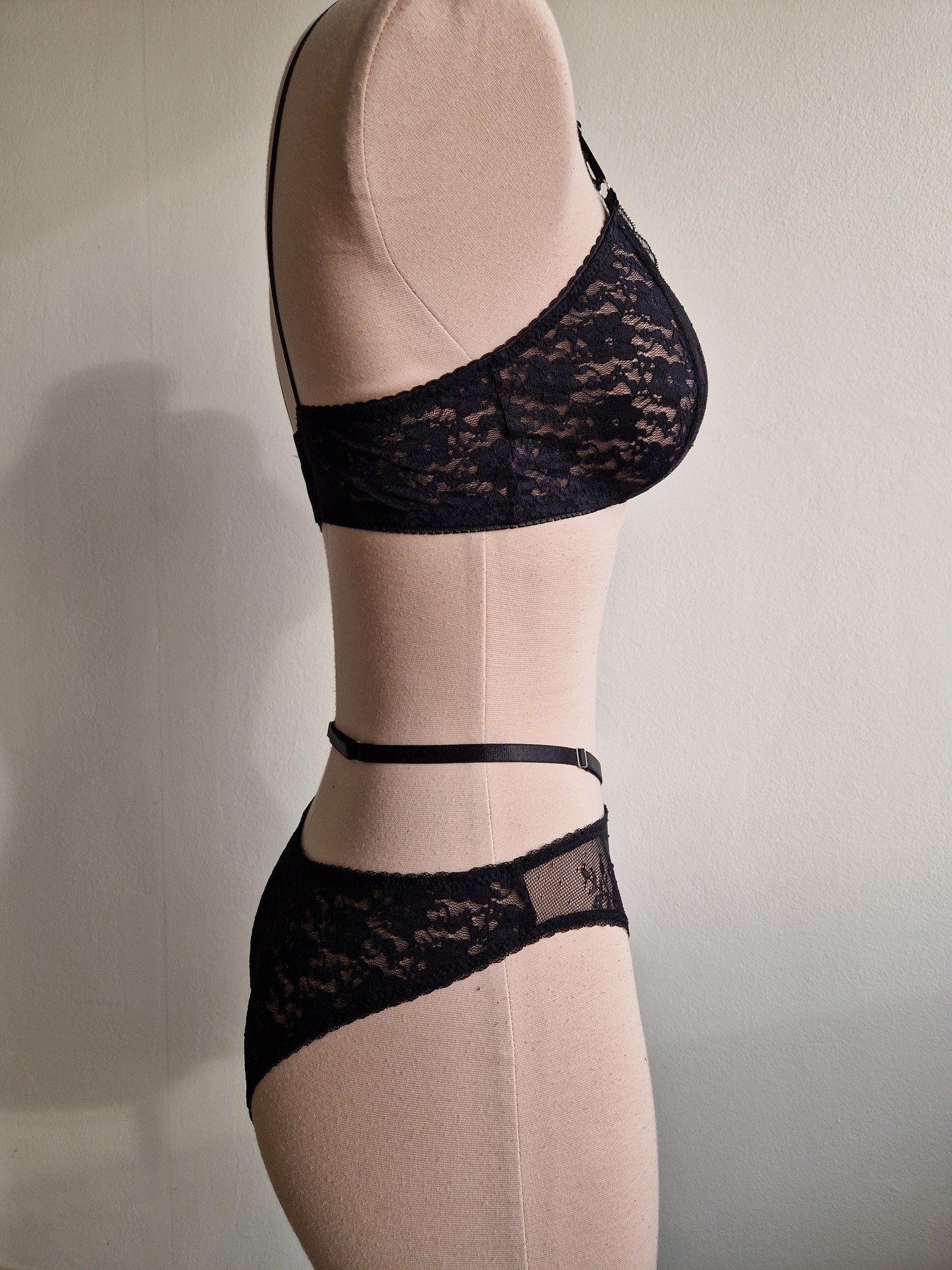 - A/B cup, M panty – black lace + Ivy Noire Lace